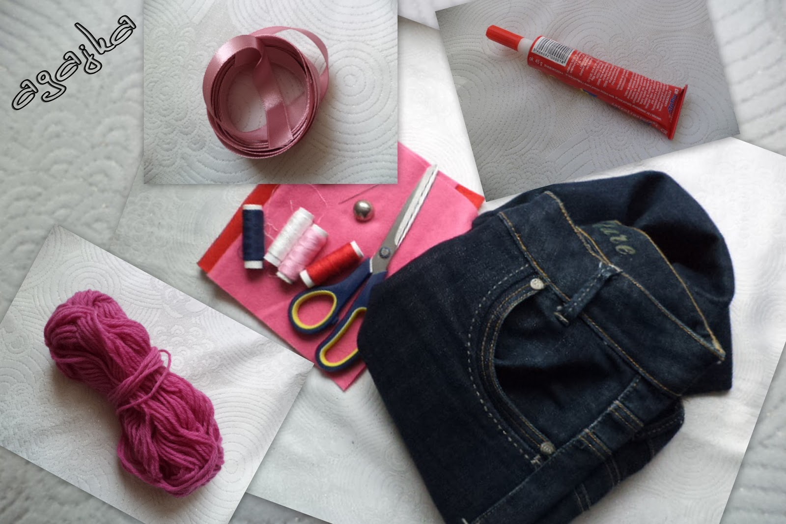 dżinsy, filc czerwony, różowy, malutkie skrawki białe (na oczy) i czarne (oczy i buciki), różowa włóczka, różowa wstążka (trudno podać mi długość- na lamówkę klapki i podszycie paska,toteż zależy od jego długości), guzik ( u mnie srebrny grzybek), igła, nici: białe, różowe, granatowe i czerwone, nożyczki, klej.